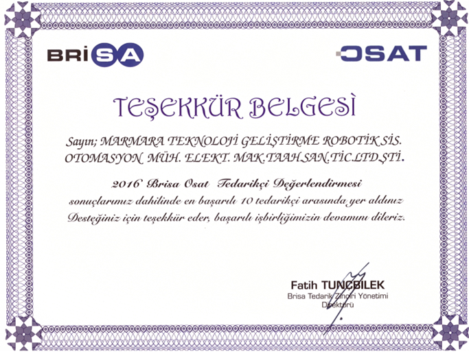 2016 Brisa Osat Tedarikçi Değerlendirmesi sonuçları dahlilinde en başarılı 10 tedarikçi arasında yer aldık.